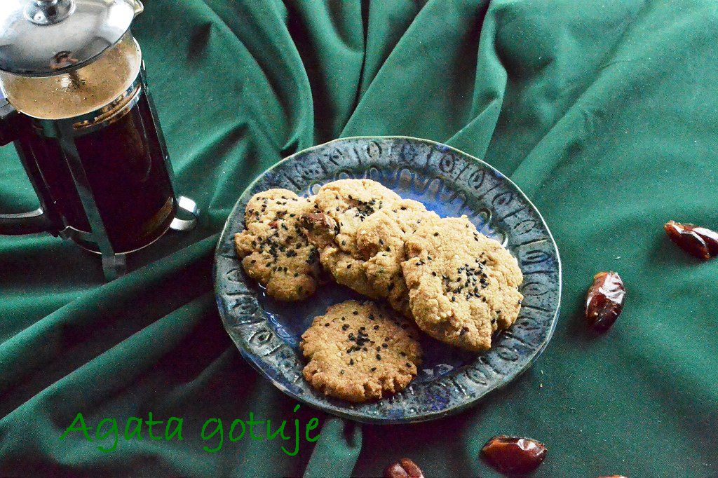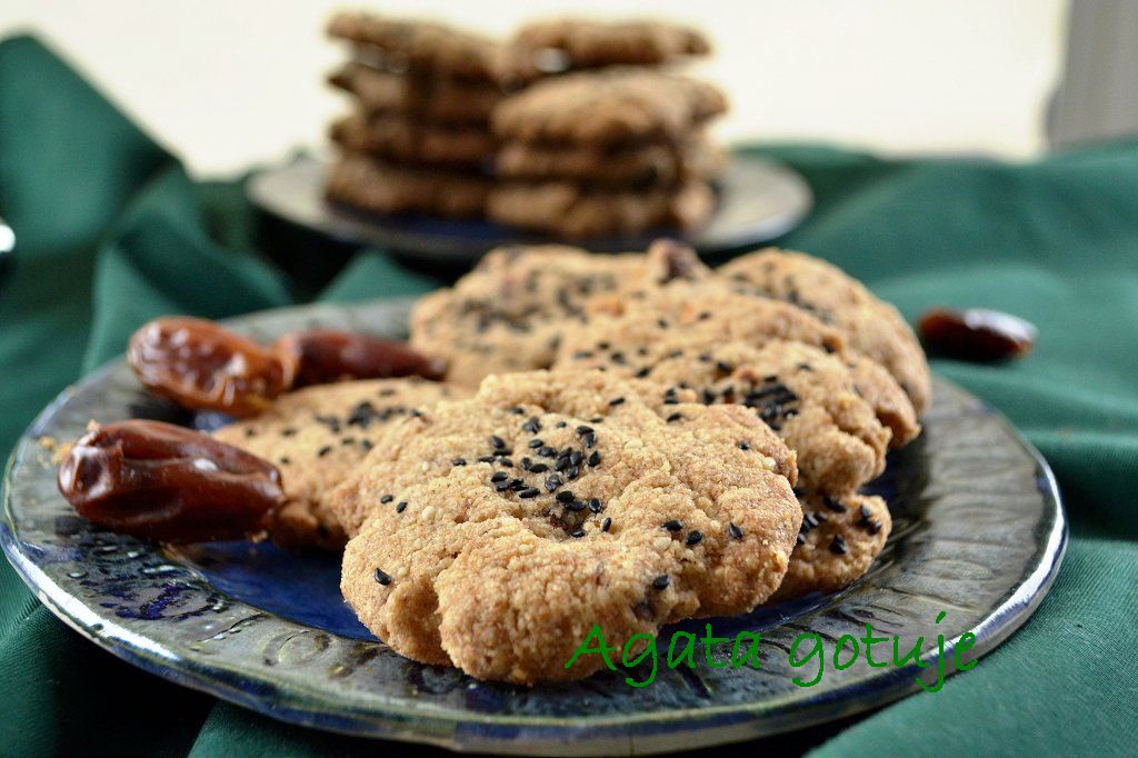 Dawno nie było czegoś słodkiego na blogu. Postanowiłam wrócić do przepisu, który wygrzebałam dość dawno temu na Moich Wypiekach. Te ciasteczka na bazie pasty tahini robiłam jakoś jesienią i spodobało mi się w nich to, że niewiele przy nich pracy. Oryginalne smakiem faktycznie przypominają chałwę, ale są dość mdłe, jednostajne. A ja lubię, jak w ciastku coś mi się przydarzy – a to jakaś rodzynka, a to kawałek czekolady. Dlatego zmodyfikowałam przepis i dodałam do ciasta posiekane daktyle. Bardzo fajnie się skomponowały.