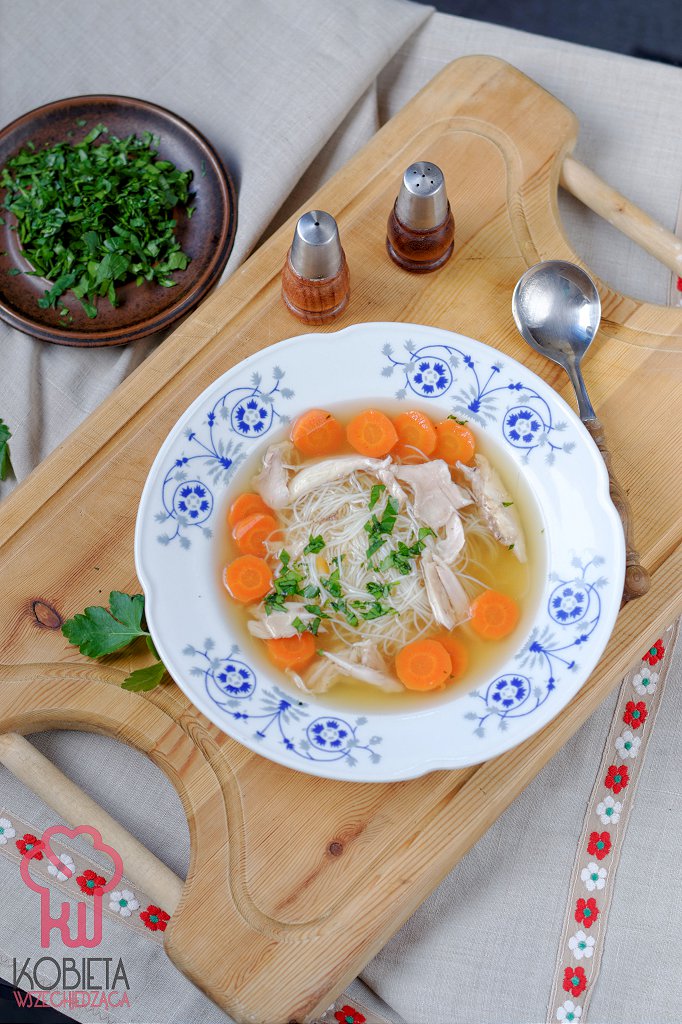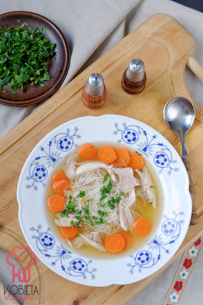 Rosół z królika podawaj z makaronem ryżowym, mięsem z królika oraz wybranymi warzywami pokrojonymi na plasterki (my zawsze zjadamy marchewki i pietruszkę z rosołu). Oprósz natką pietruszki lub kolendry, jeśli lubisz.