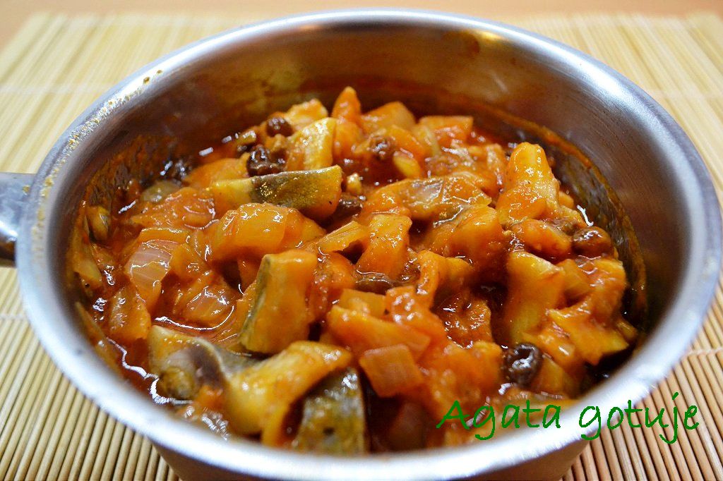 Kiedy cebula będzie już miękka, dodaj rodzynki, podlej odrobiną wody (tyle, aby powstał sos) i rozprowadź koncentrat pomidorowy oraz pastę curry (radzę próbować, czy nie za ostre, bo pasta paście nierówna).